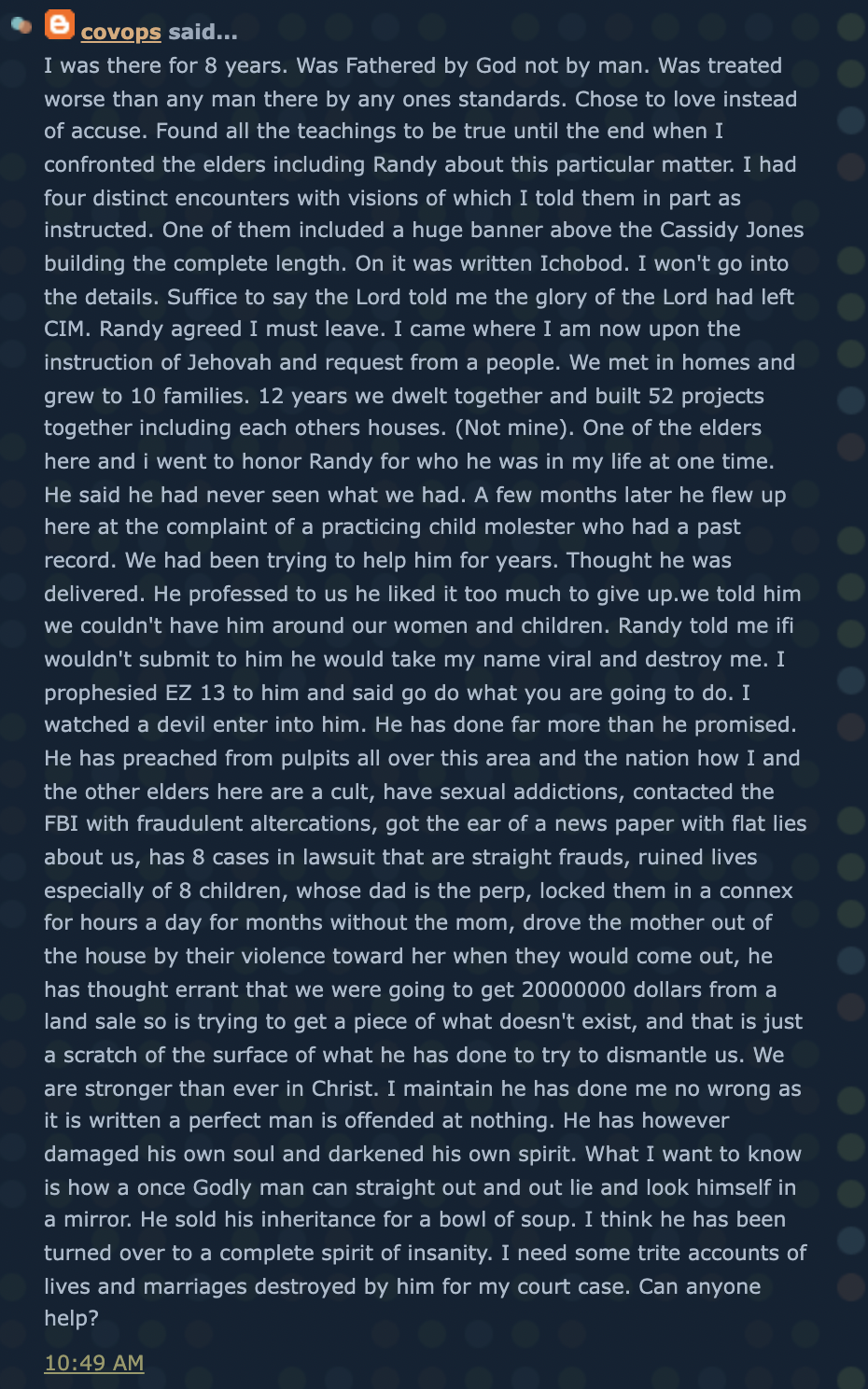 I was there for 8 years. Was Fathered by God not by man. Was treated worse than any man there by any ones standards. Chose to love instead of accuse. Found all the teachings to be true until the end when I confronted the elders including Randy about this particular matter. I had four distinct encounters with visions of which I told them in part as instructed. One of them included a huge banner above the Cassidy Jones building the complete length. On it was written Ichobod. I won't go into the details. Suffice to say the Lord told me the glory of the Lord had left CIM. Randy agreed I must leave. I came where I am now upon the instruction of Jehovah and request from a people. We met in homes and grew to 10 families. 12 years we dwelt together and built 52 projects together including each others houses. (Not mine). One of the elders here and i went to honor Randy for who he was in my life at one time. He said he had never seen what we had. A few months later he flew up here at the complaint of a practicing child molester who had a past record. We had been trying to help him for years. Thought he was delivered. He professed to us he liked it too much to give up.we told him we couldn't have him around our women and children. Randy told me ifi wouldn't submit to him he would take my name viral and destroy me. I prophesied EZ 13 to him and said go do what you are going to do. I watched a devil enter into him. He has done far more than he promised. He has preached from pulpits all over this area and the nation how I and the other elders here are a cult, have sexual addictions, contacted the FBI with fraudulent altercations, got the ear of a news paper with flat lies about us, has 8 cases in lawsuit that are straight frauds, ruined lives especially of 8 children, whose dad is the perp, locked them in a connex for hours a day for months without the mom, drove the mother out of the house by their violence toward her when they would come out, he has thought errant that we were going to get 20000000 dollars from a land sale so is trying to get a piece of what doesn't exist, and that is just a scratch of the surface of what he has done to try to dismantle us. We are stronger than ever in Christ. I maintain he has done me no wrong as it is written a perfect man is offended at nothing. He has however damaged his own soul and darkened his own spirit. What I want to know is how a once Godly man can straight out and out lie and look himself in a mirror. He sold his inheritance for a bowl of soup. I think he has been turned over to a complete spirit of insanity. I need some trite accounts of lives and marriages destroyed by him for my court case. Can anyone help?