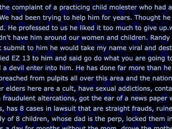 I am in a horrific battle right now because of Randy. He has done things here so exceedingly evil a criminal can't think this up. He came here and told me if we wouldn't submit to him he'd take my name viral and destroy me. He has done even more than he promised. I need help. I need to show the courts here your accounts. He has turned children against mothers and drove the mothers out of the house. They have become so violent it isn't safe for them to see their own children. He is in league with a known practicing pedophile, a husband beater, a wife abuser, and a woman that he himself called a pathological liar. I won't go into the details. Suffice to say he spread all manner of lies about us, fabricated stories to the FBI and many other agencies, cost us over a hundred thousand dollars in legal fees, and destroyed 8 children in all. We ate still going through court on more false allegations and trumped up cases. I need witnesses to this man's character and his destruction. Can you help?